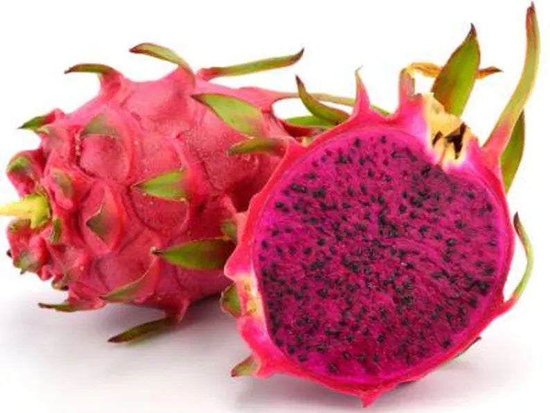 Red dragon fruit is a vibrant, tropical beauty with striking pink skin and deep magenta flesh speckled with tiny black seeds. Mildly sweet and refreshingly juicy, it has a delicate flavor reminiscent of berries and melon. Delicious eaten fresh, blended into smoothies, or used to add a stunning pop of color to fruit bowls and desserts.